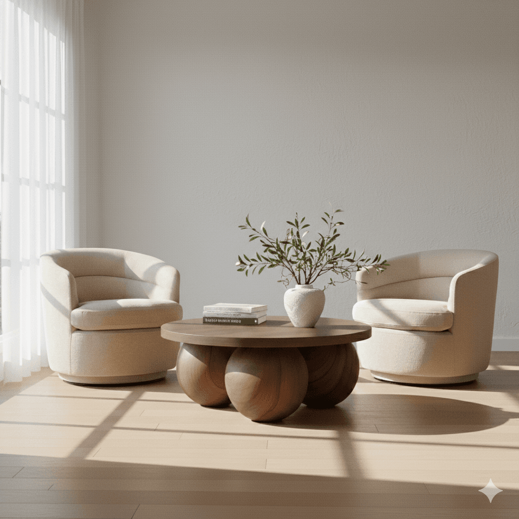 This is for anyone with a bright, beautiful room that still feels unfinished. The before wasn’t bad — just empty, echoing, undefined. By anchoring the space with two curved chairs, a sculptural wood table, and one living element, the room shifts from blank to intentional without a single structural change. It works because symmetry and softness signal safety to the brain, while natural materials add warmth that white walls alone can’t carry. And it’s attainable — just a few well-chosen pieces creating a full emotional reset.