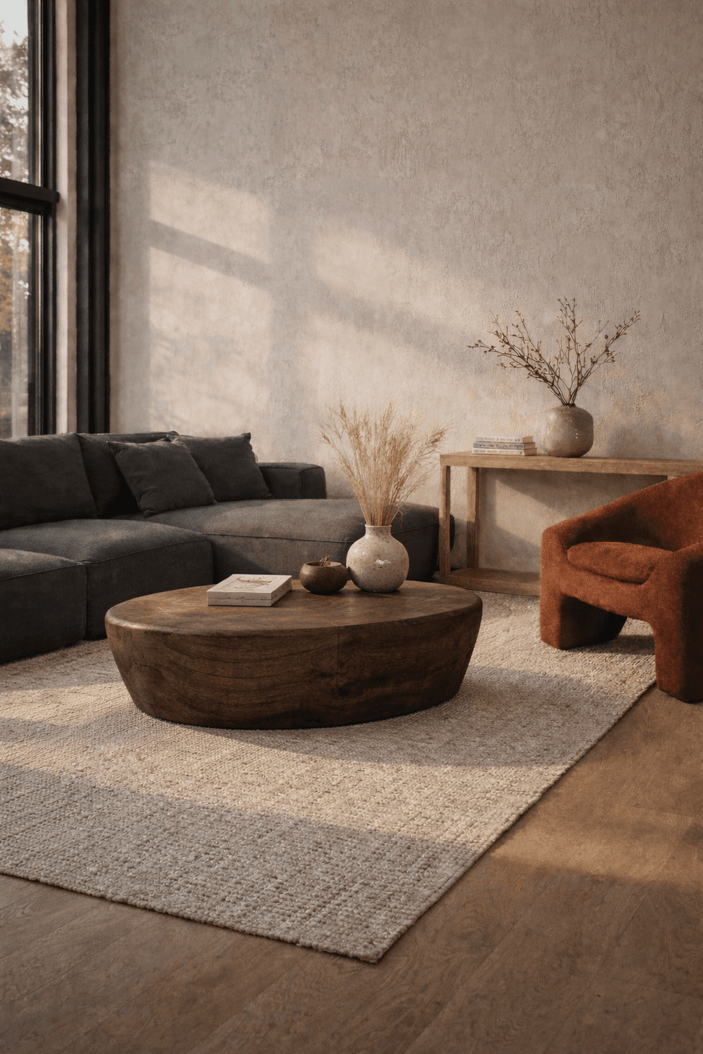 Some rooms don’t need renovation. They need grounding. This space started as a quiet shell — textured plaster walls, warm timber floors, late afternoon light spilling through tall windows. The architecture already carried warmth, but it lacked identity. The transformation is not dramatic. It’s deliberate.