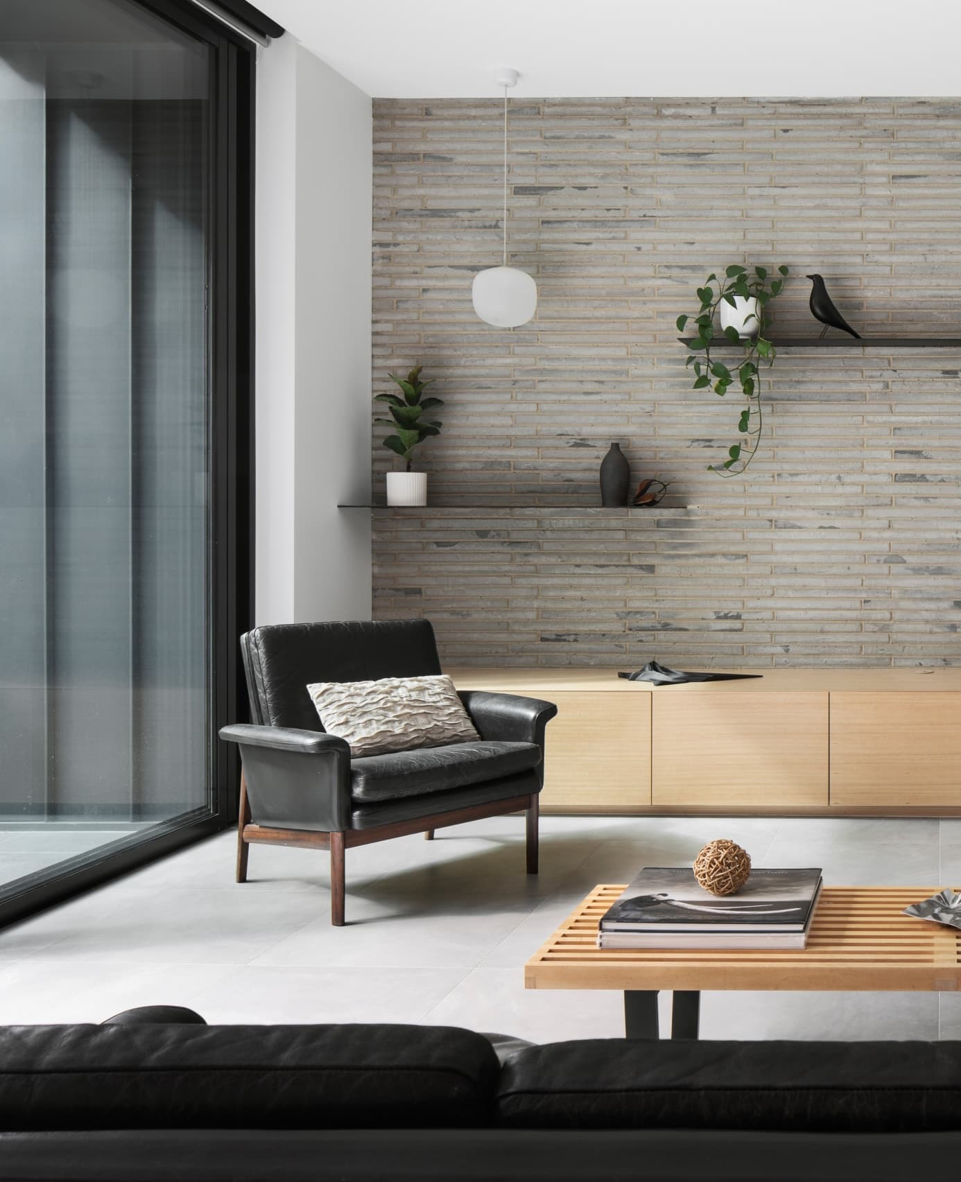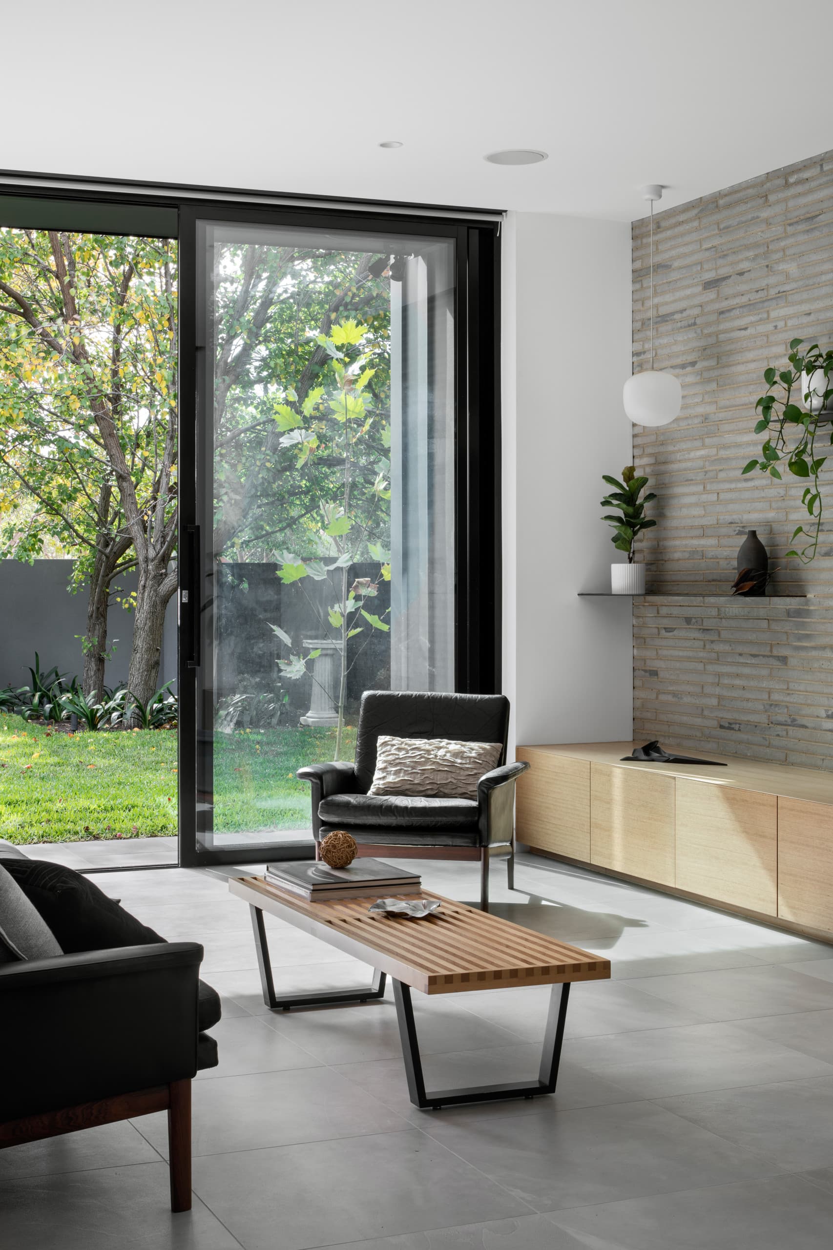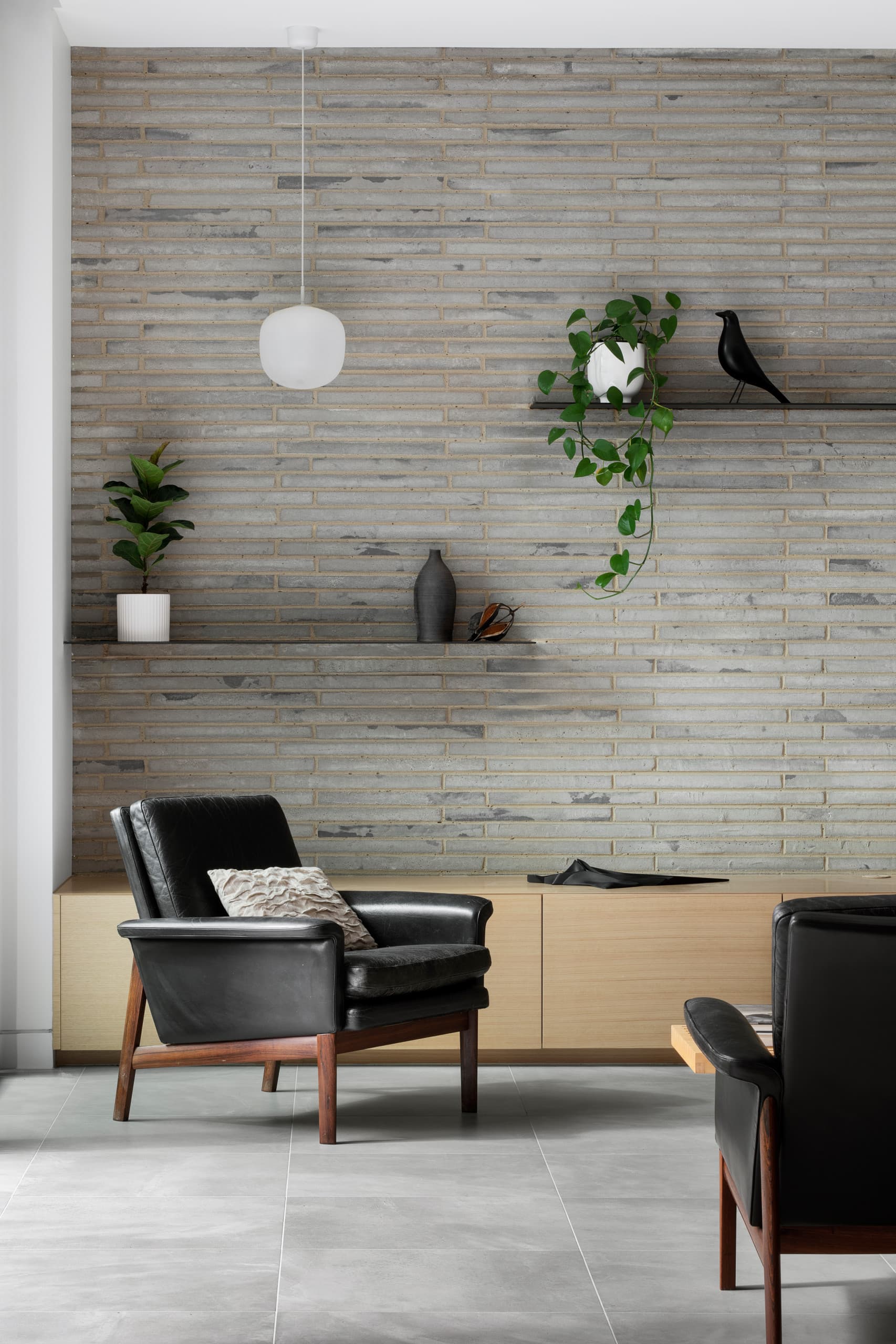 Expressed raw, silvery brickwork and inky, black charred-timber cladding lent a honed refinement to the built form. Internally, the lustrous palette includes soothing light and oyster tones.