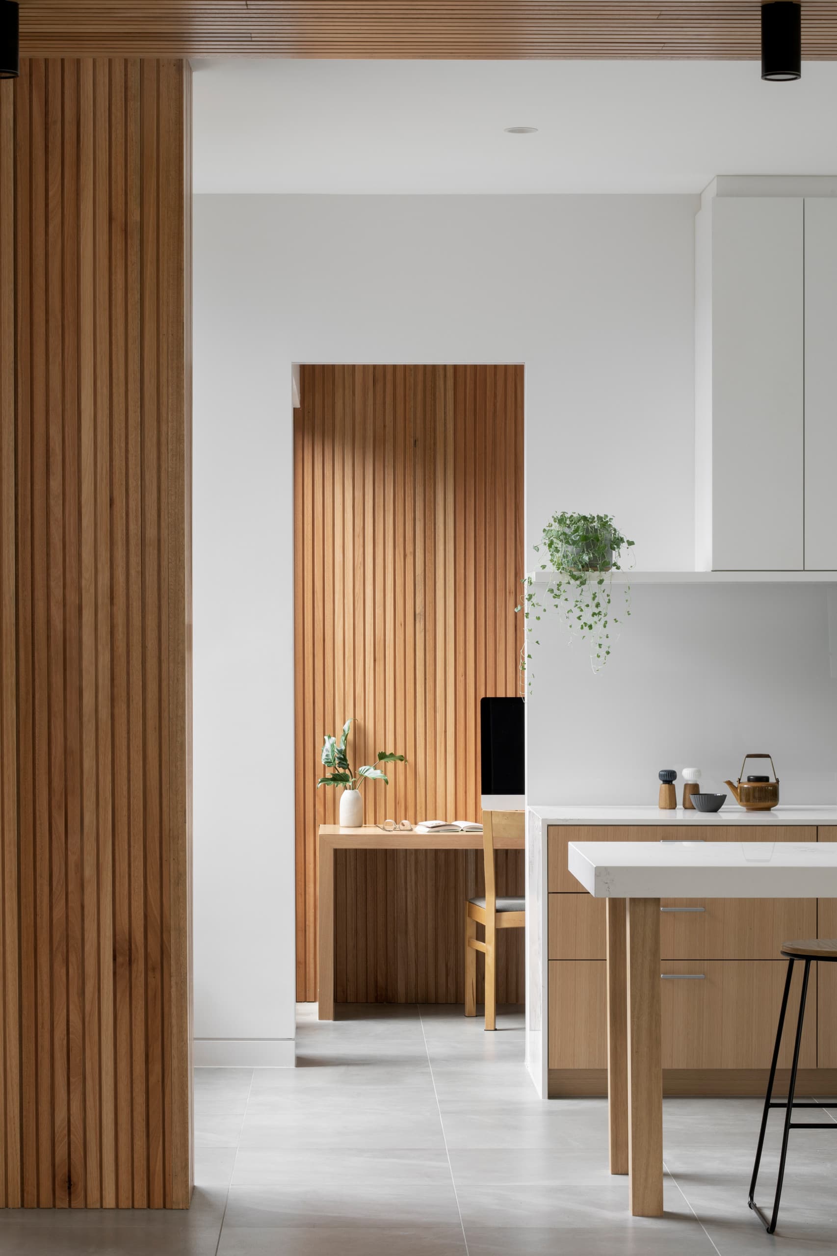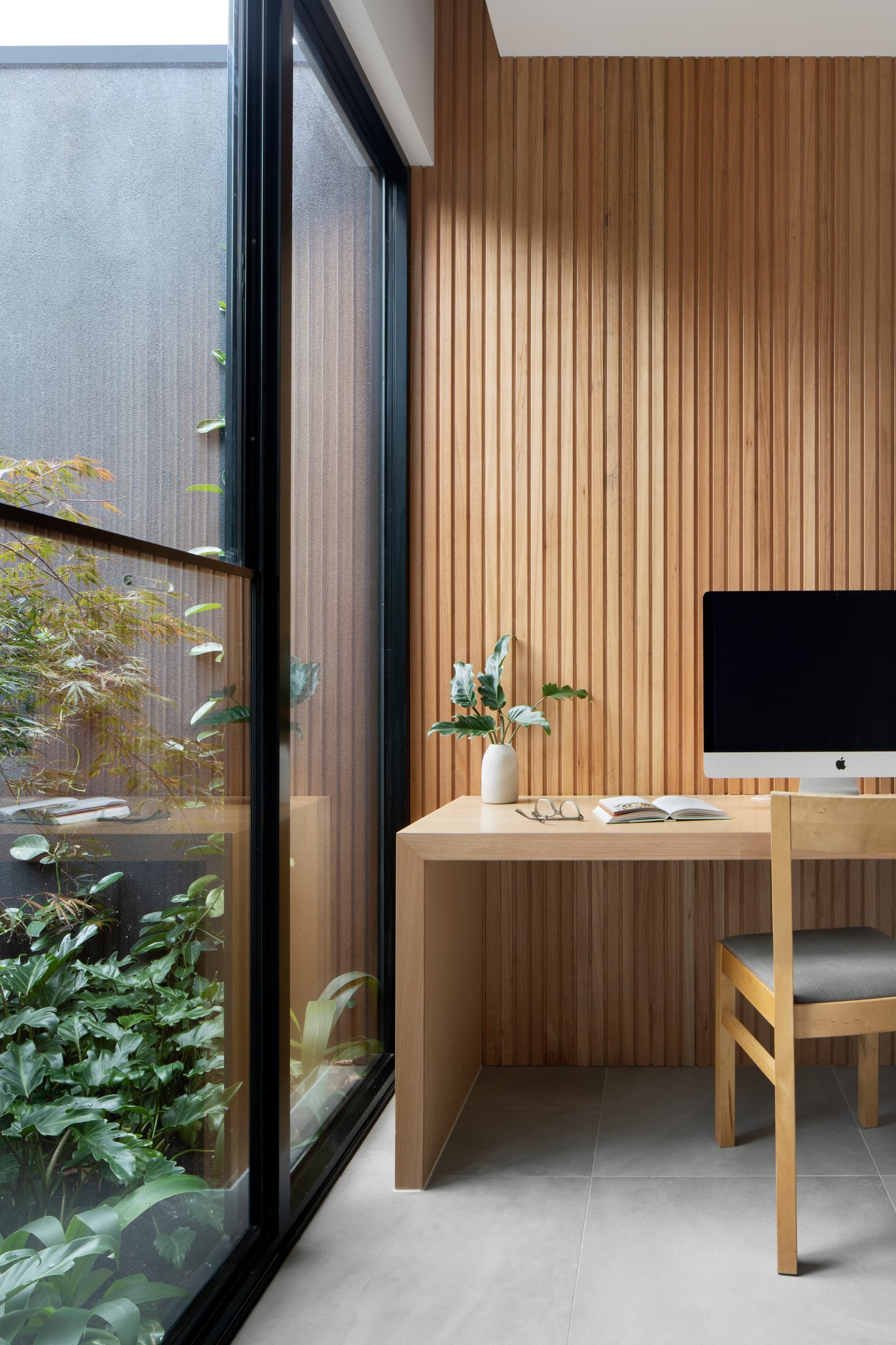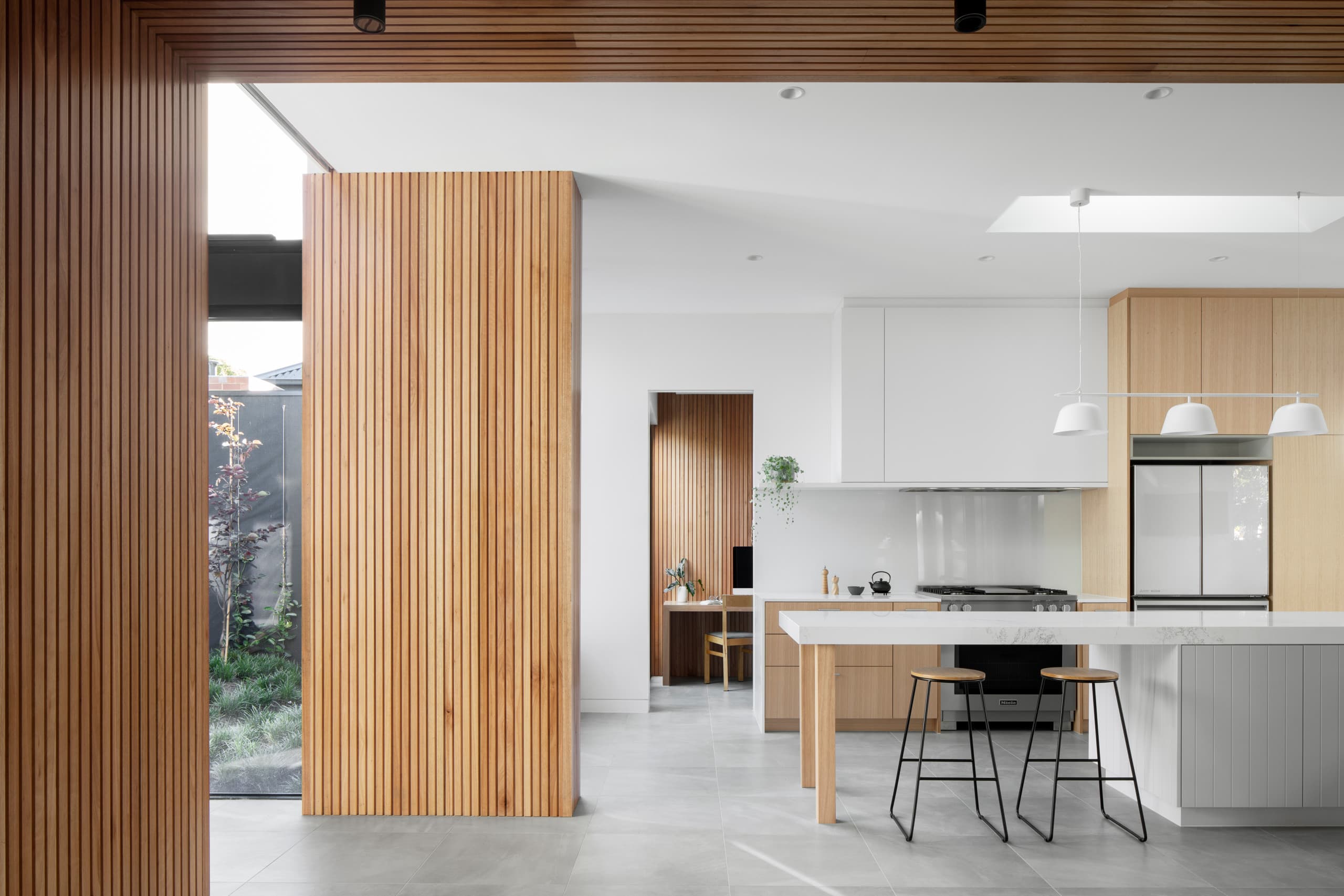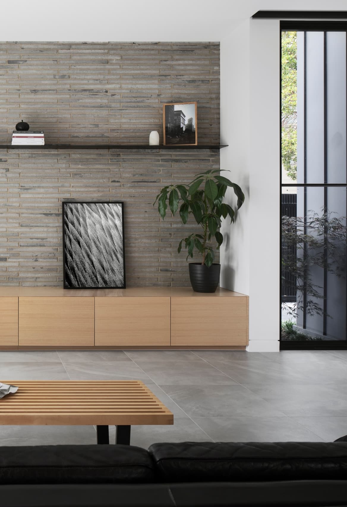 Expressed raw, silvery brickwork and inky, black charred-timber cladding lent a honed refinement to the built form. Internally, the lustrous palette includes soothing light and oyster tones.