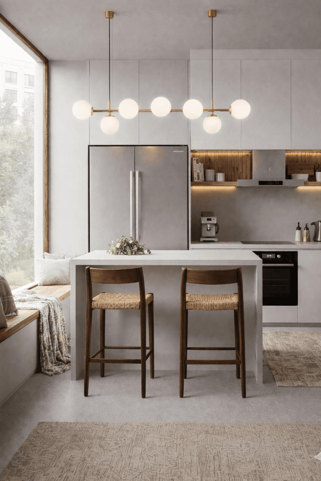 This modern kitchen balances clean architectural lines with warmth and texture. Hand-woven timber stools add an organic contrast to the minimalist island, while the Ivy six-light glass pendant floats effortlessly above, casting a gentle, even glow. Neutral tones, natural light, and quiet details come together to create a refined yet welcoming space.
